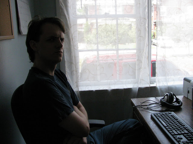 | Justin, at a previous apartment, sitting grumpily at the computer. |